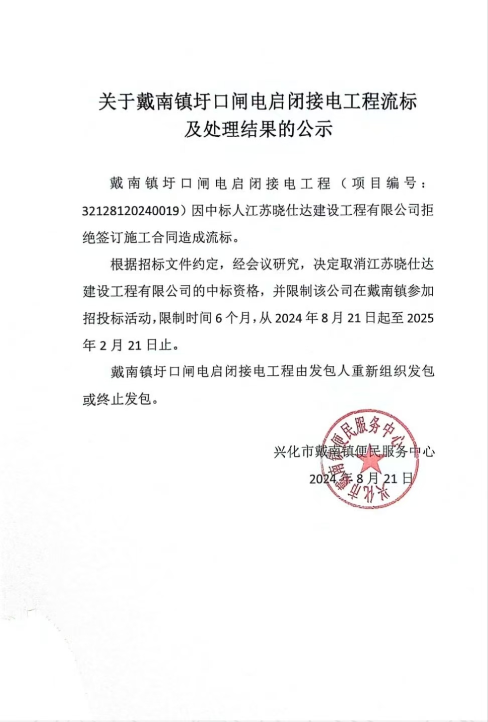 关于戴南镇圩口闸电启闭接电工程流标及处理结果的公示
